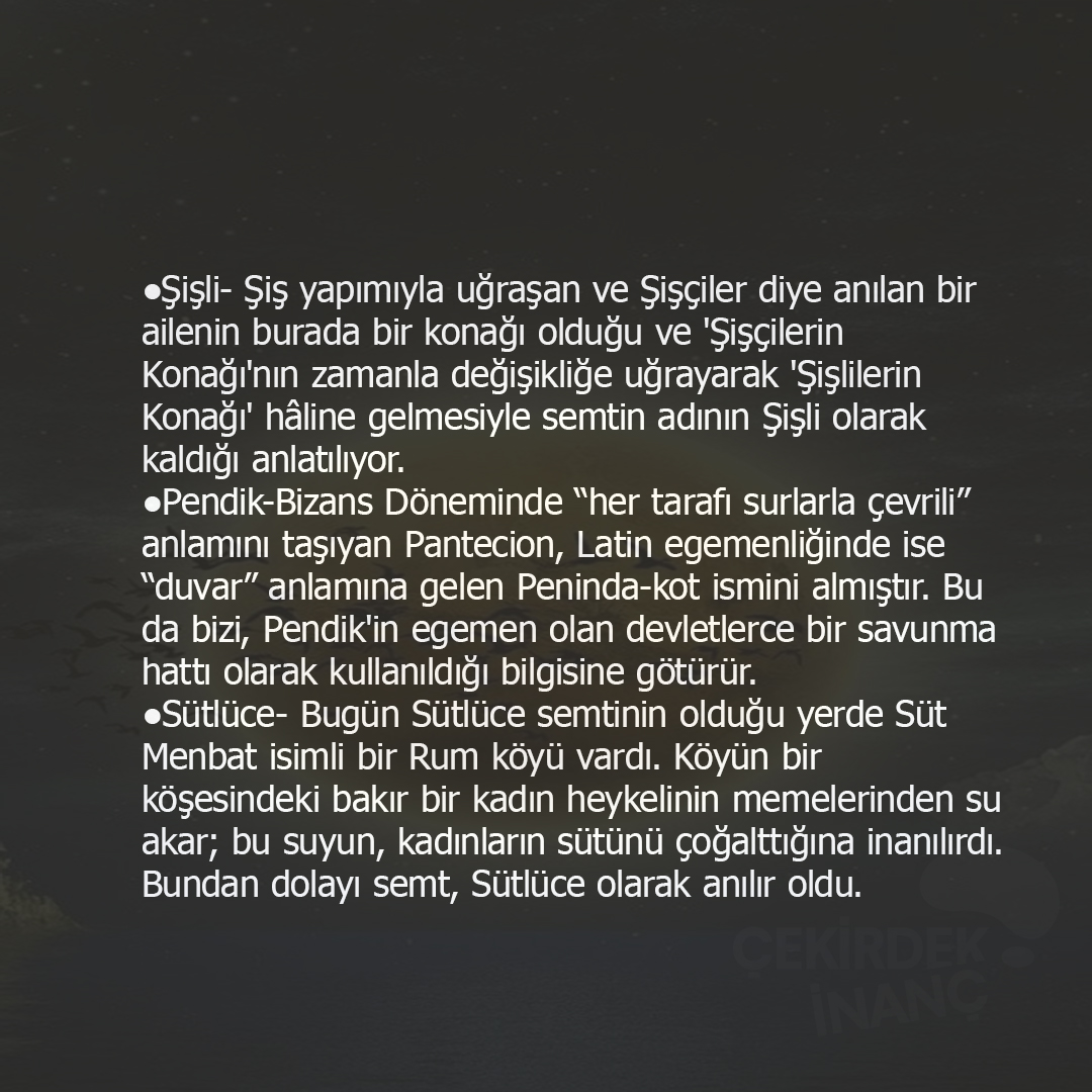 ●Pendik-Bizans Döneminde “her tarafı surlarla çevrili” anlamını taşıyan Pantecion, Latin egemenliğinde ise “duvar” anlamına gelen Peninda-kot ismini almıştır. Bu da bizi, Pendik’in egemen olan devletlerce bir savunma hattı olarak kullanıldığı bilgisine götürür.
