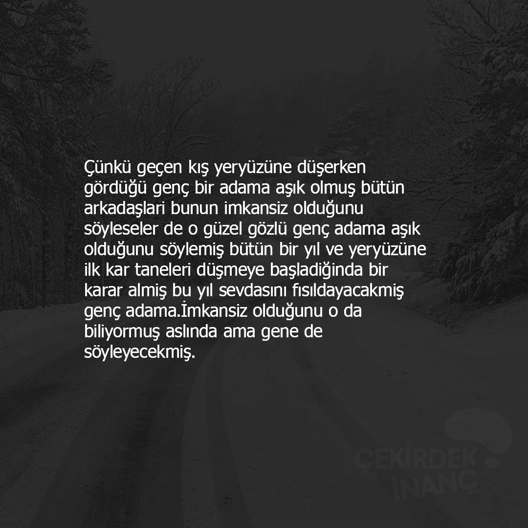 Çünkü geçen kış yeryüzüne düşerken gördüğü genç bir adama aşık olmuş bütün arkadaşlari bunun imkansiz olduğunu söyleseler de o güzel gözlü genç adama aşık olduğunu söylemiş bütün bir yıl ve yeryüzüne ilk kar taneleri düşmeye başladiğinda bir karar almiş bu yıl sevdasını fısıldayacakmiş genç adama.İmkansiz olduğunu o da biliyormuş aslında ama gene de söyleyecekmiş.