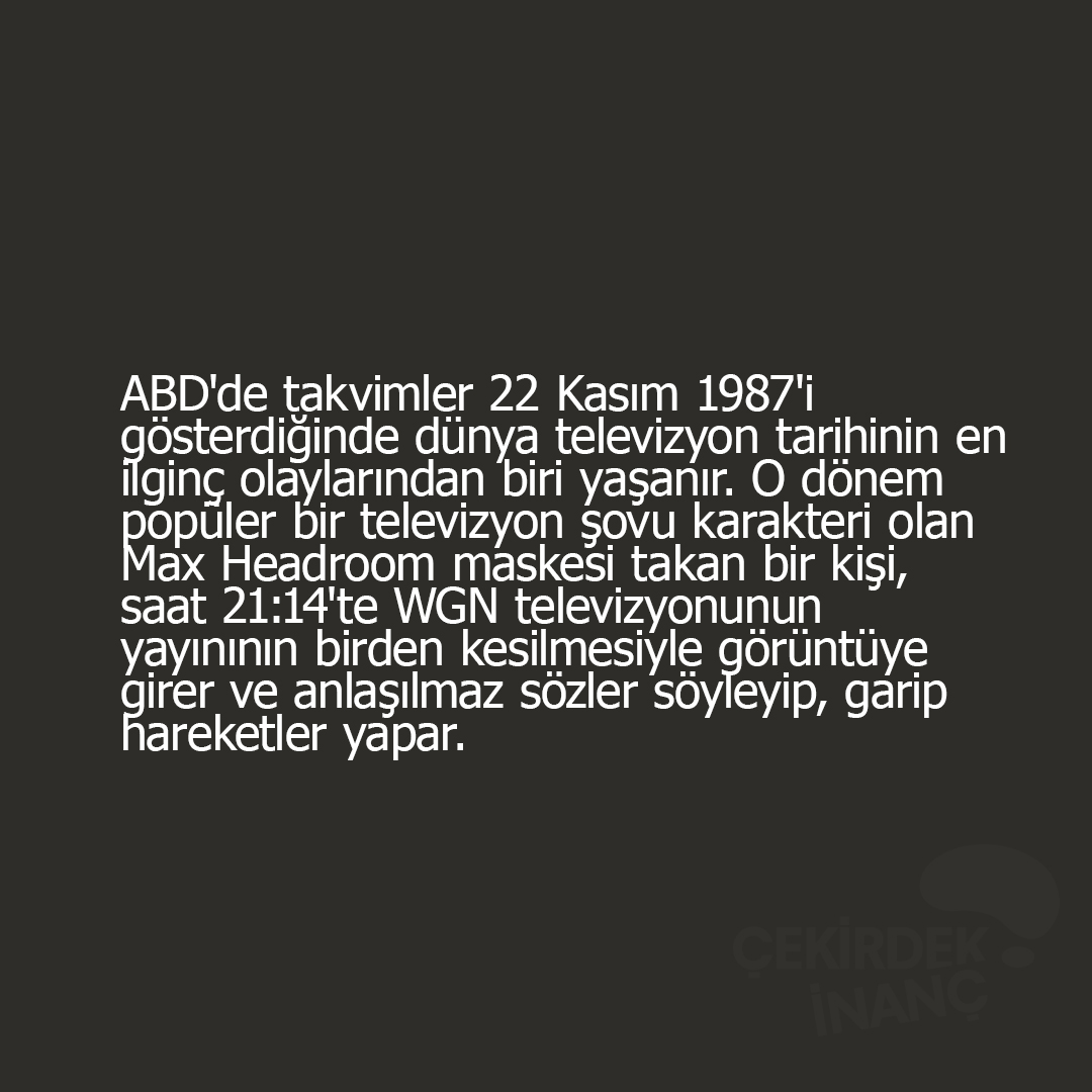 ABD’de takvimler 22 Kasım 1987’i gösterdiğinde dünya televizyon tarihinin en ilginç olaylarından biri yaşanır. O dönem popüler bir televizyon şovu karakteri olan Max Headroom maskesi takan bir kişi, saat 21:14’te WGN televizyonunun yayınının birden kesilmesiyle görüntüye girer ve anlaşılmaz sözler söyleyip, garip hareketler yapar. Bu yayın 28 saniye sonra televizyon görevlileri tarafından kesilir. İkinci denemesi ise saat 23:15’te, başka bir televizyon kanalının yayınına sızarak olur. Bu kaçak yayın ise görevliler tarafından kesilemez, 88 saniye boyunca ekranda kalır ve kendiğilinden sona erer.